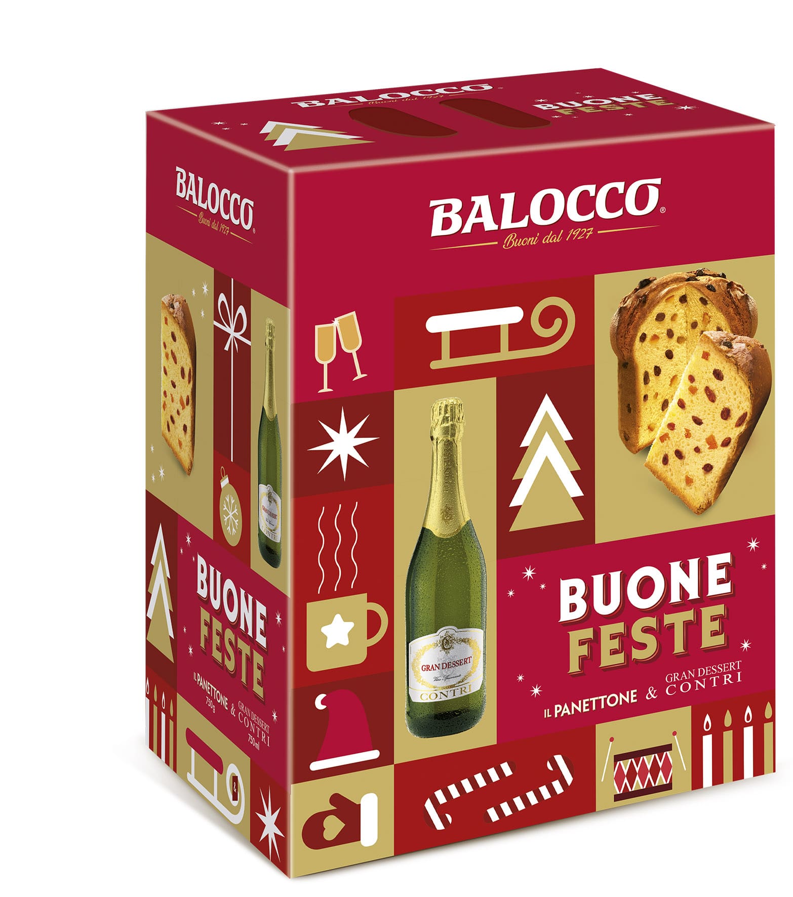 Een verfijnde Italiaanse geschenkset met een zachte Panettone van Balocco en een lichtzoete Spumante Grand Dessert van Contri. Ideaal voor feestdagen, bezoek of stijlvolle cadeaumomenten.