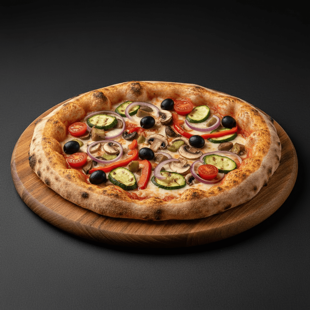 San Marzano tomaten DOP, Fior di Latte, rode ui, courgettes, aubergines, champignons, paprika’s, zwarte olijven, kerstomaatjes, extra vergine olijfolie